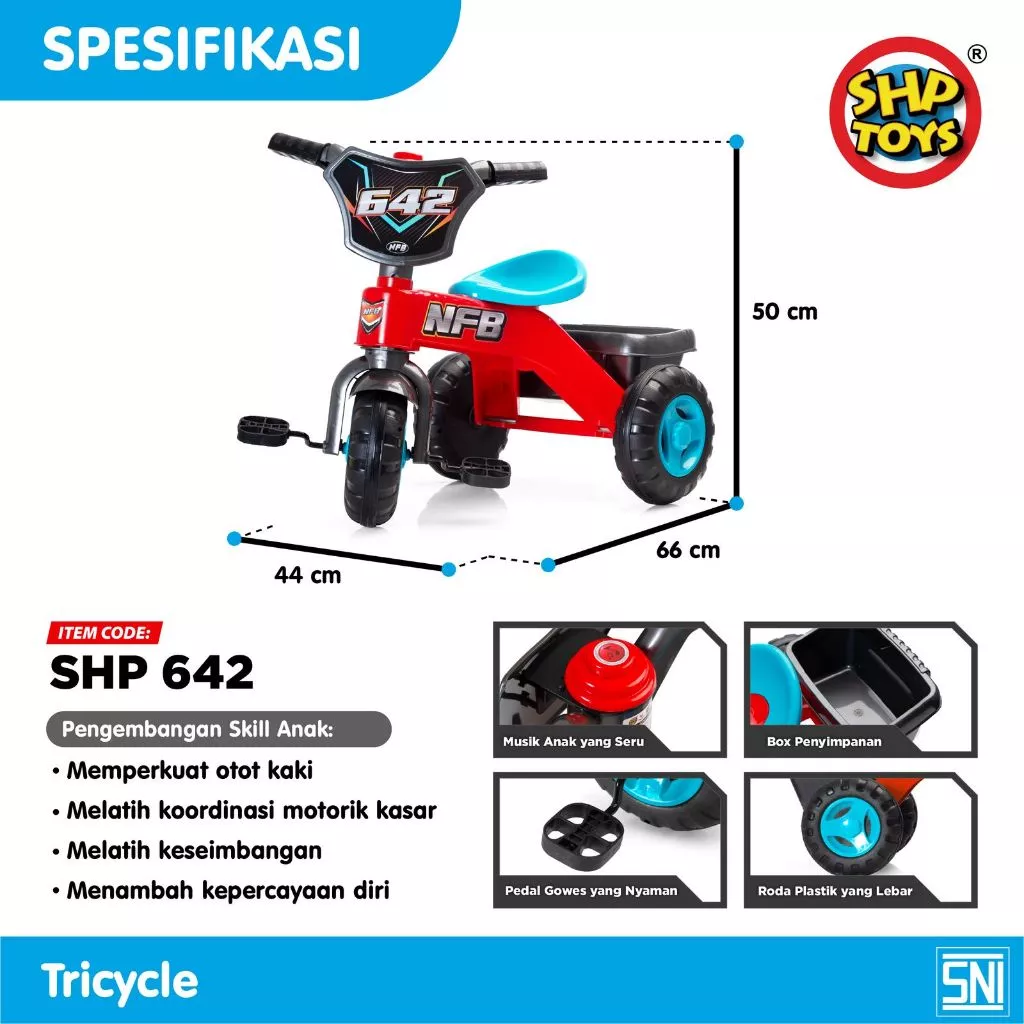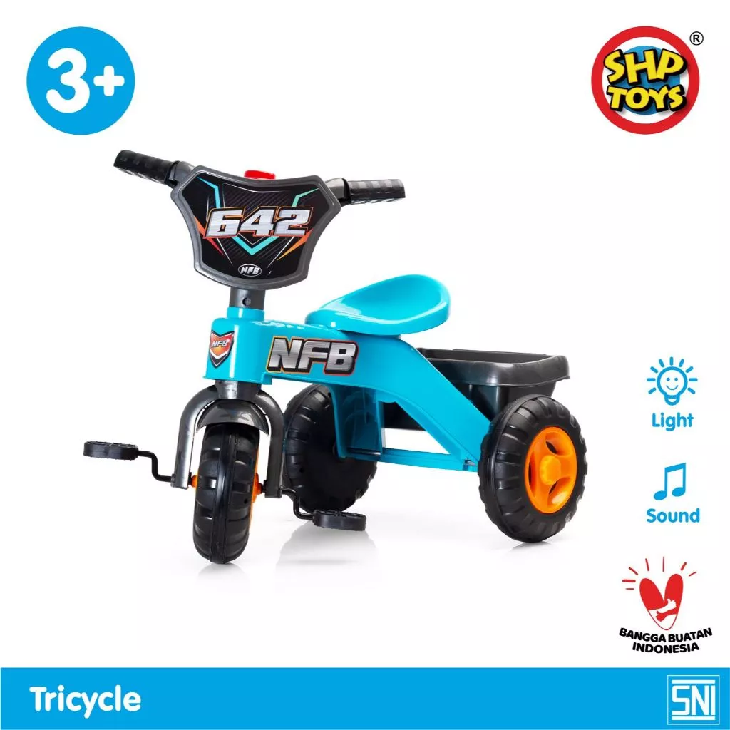 Sepeda roda tiga NFB SHP Toys dirancang dengan musik anak yang seru, pedal yang nyaman, serta box penyimpanan praktis. Mainan ini membantu melatih kekuatan otot kaki, koordinasi motorik kasar, keseimbangan, dan menambah rasa percaya diri anak. Cocok untuk usia 3 tahun ke atas.